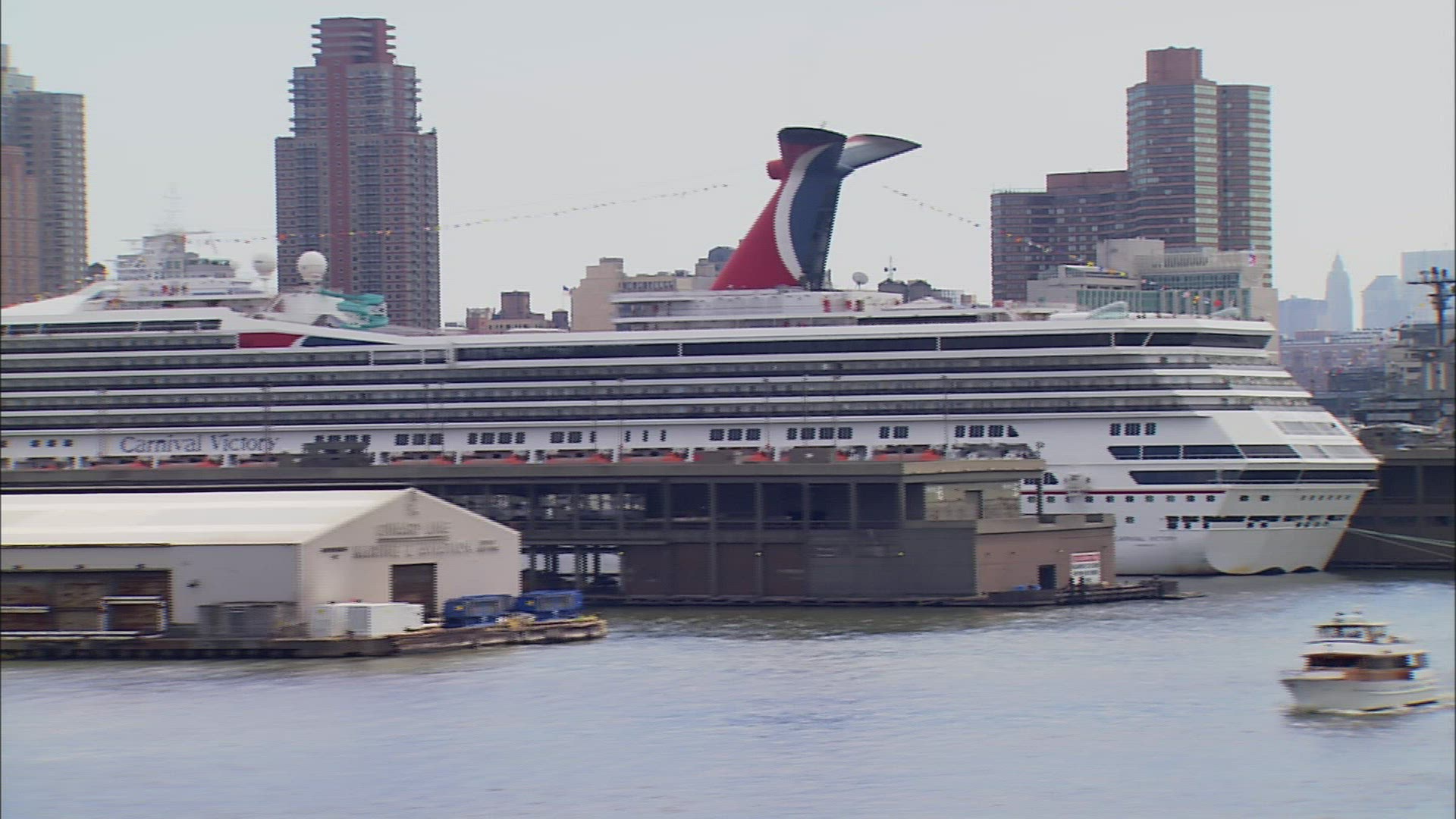 New York water taxi passes along East River with Manhattan in the background