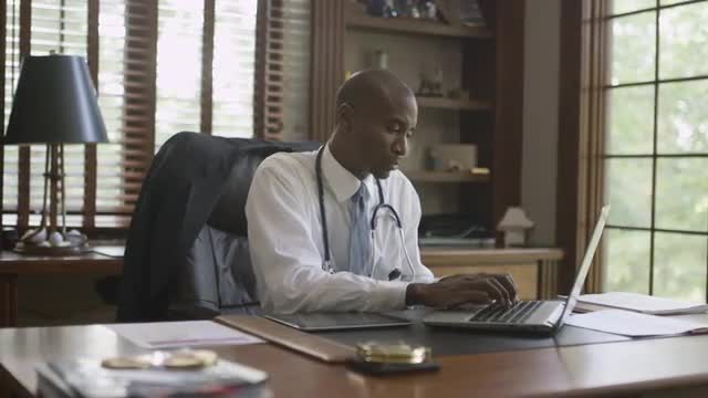 Black doctor working on laptop in office