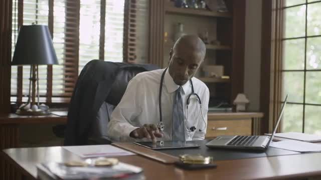 459930 - Black doctor working on laptop in office
