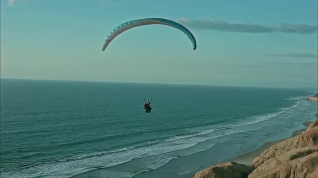 > Paragliders flying over ocean