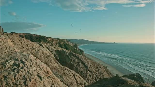 > Paragliders flying over ocean