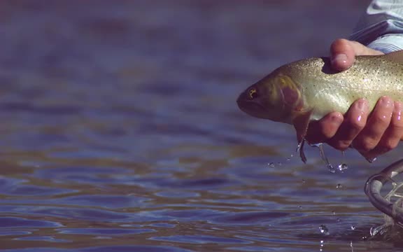 Slow motion shot of fish being release out of net back into stream
