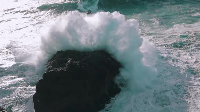 Slow Motion Ocean Waves Breaking on Rocks, storm weather