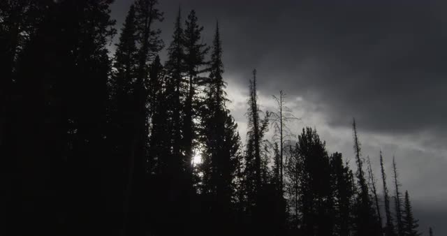 This is a static, wide, 4K shot of some forest trees being illuminated by the sun. The sun is behind the trees, silhouetting them. Storm clouds hover above the trees.