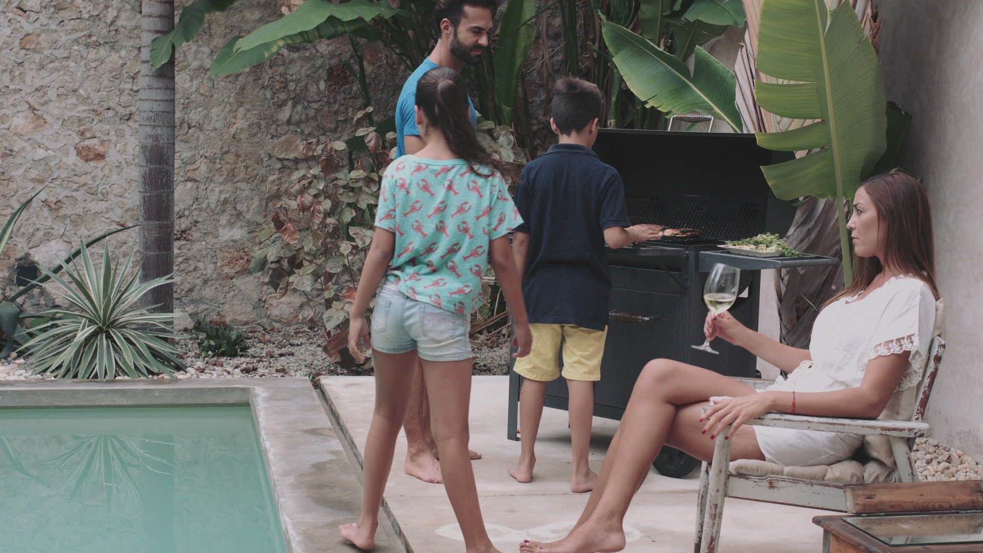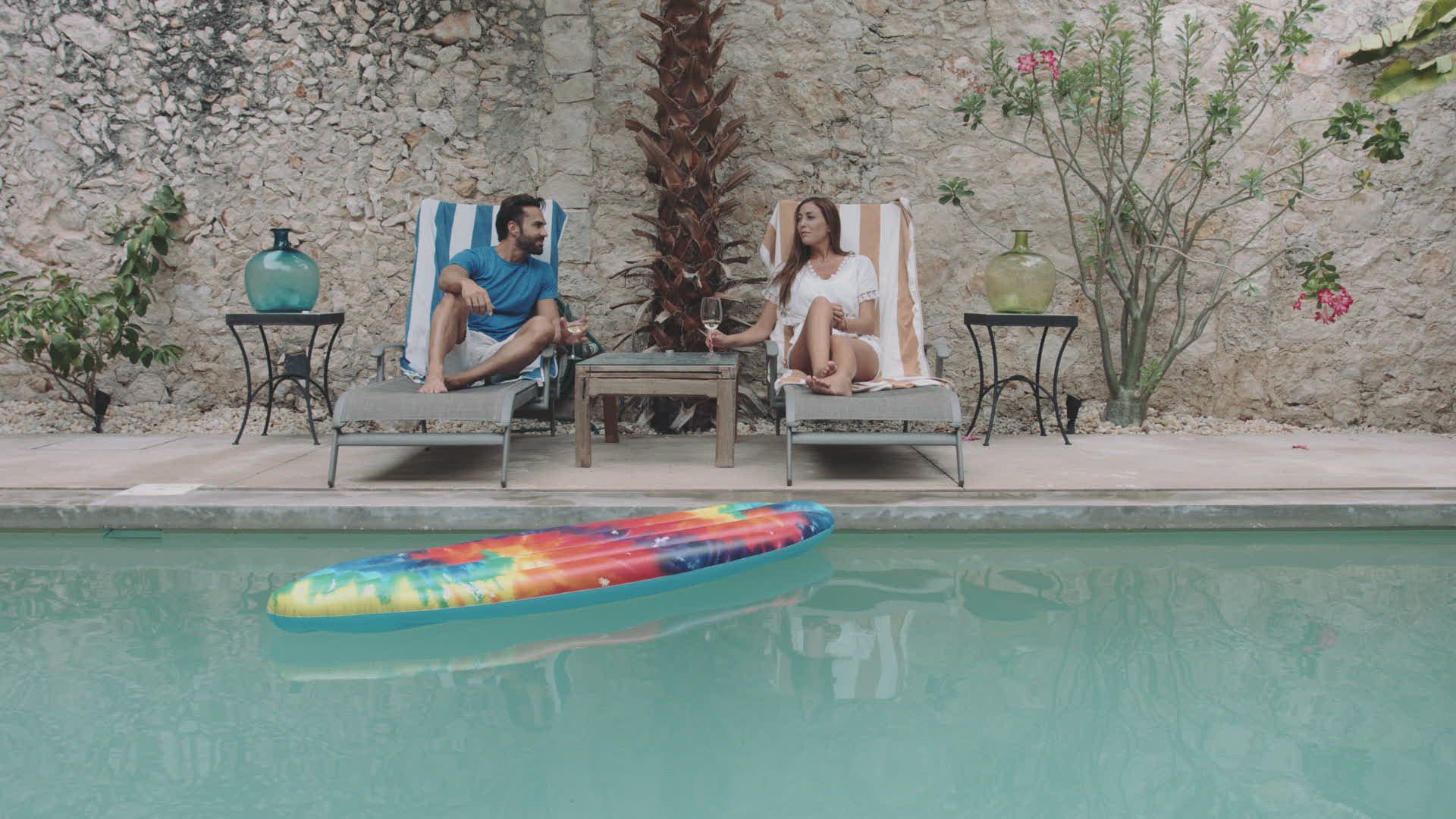 Woman sitting on edge of swimming pool, swinging legs in water, drinking wine, slow motion
