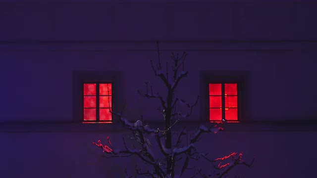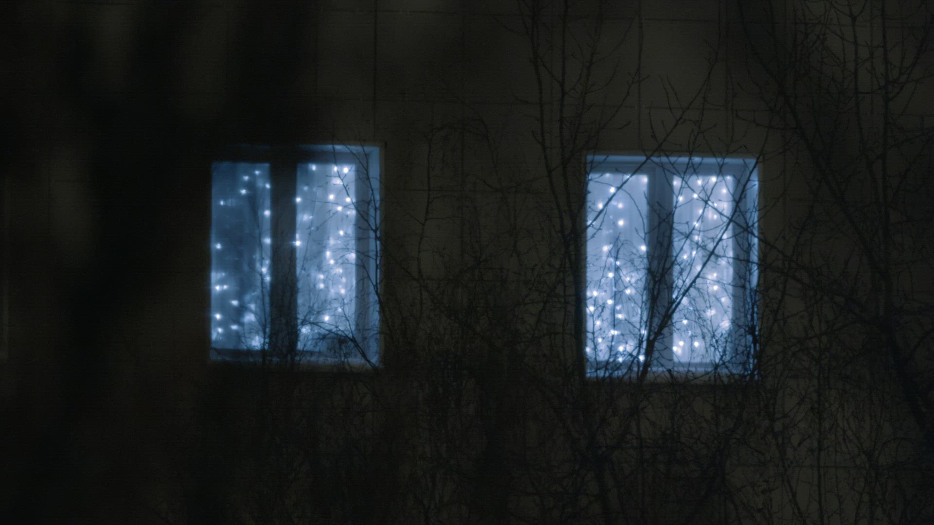 Grandmother closes blinds on a Christmas evening with a small white Christmas tree in the window, viewed from outside the house