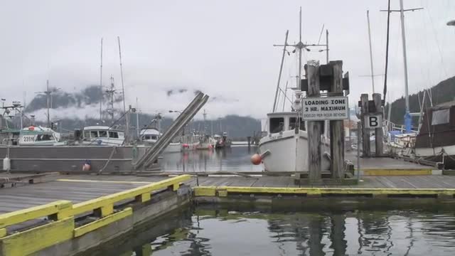 Fishing boats sitting in the harbour in between trips. Beautiful snowcapped mountains in backdrop. British Columbia