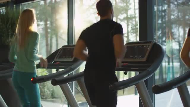 Young athletic men and women exercising and running on treadmill in sport gym. Shot on RED Cinema Camera in 4K (UHD).