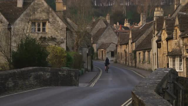 Young man in an elegant beige trench coat rides a retro scooter across a bridge. Shot on RED Cinema Camera in 4K (UHD).