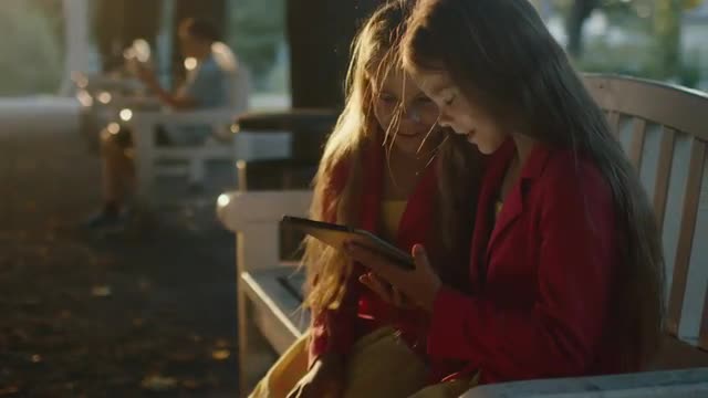 Twin Girls are Sitting at Park and Using Tablet PC for Entertainment at Sunset Time