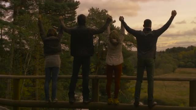 Group of people walk near the edge of a hill, take each other hands and raise them while looking at a forest landscape at sunset.