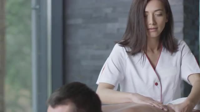 Handsome man is getting a relaxing massage from a woman masseur in wellness center. Shot on RED Cinema Camera in 4K (UHD).
