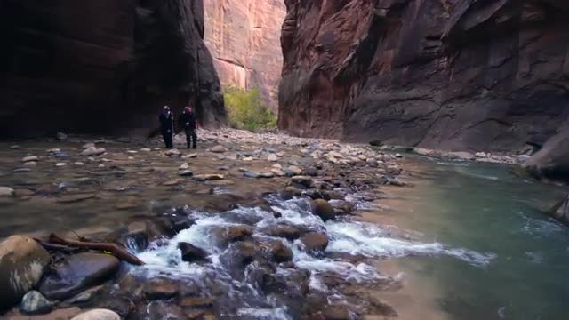 740315 - Panning view of the Zion Narrows as two people are hiking