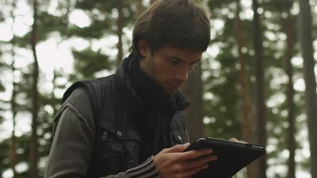 Long haired man in dark autumn clothes and scarf is standing in a forest and using a tablet computer.