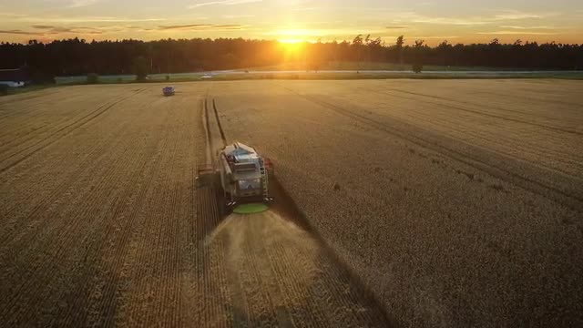 Aerial drone shot of a combine harvester working in a field at sunset.