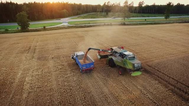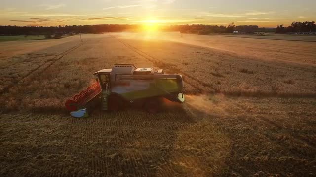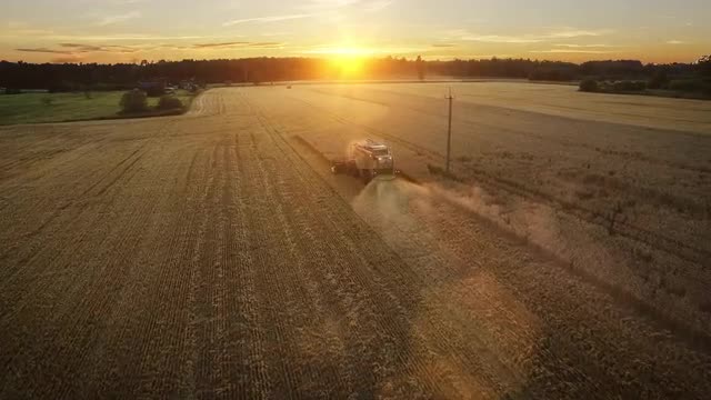 Aerial drone overhead shot of a combine harvester working in a field at sunset.