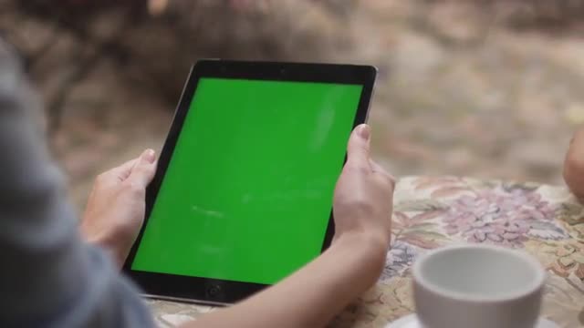 Girl is Holding Tablet in Portrait Mode in Outdoor Coffee Shop