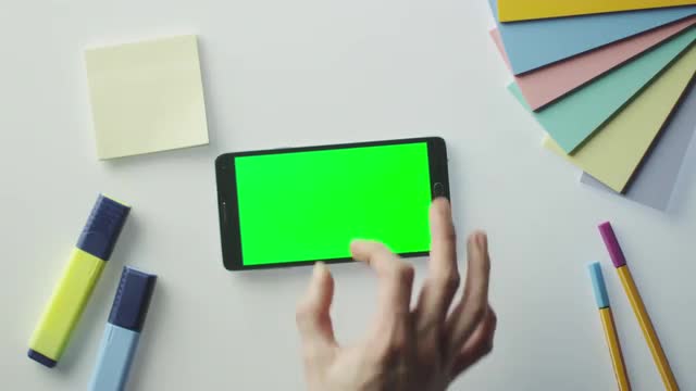 Designer is Using Android Phone with Green Screen in Landscape Mode. Top View.