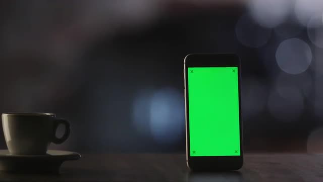 Designer is Using Mobile Phone with Green Screen in Landscape Mode. Top View.