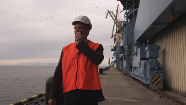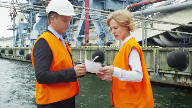 Woman Manager and Engineer in Hard Hats are Talking in Cargo Harbor. Shot on RED Cinema Camera in 4K (UHD).