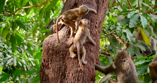 > Young Baboons play in tree