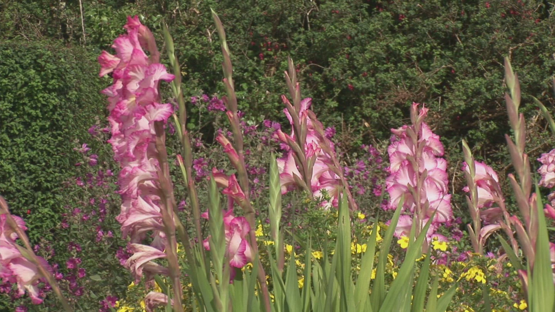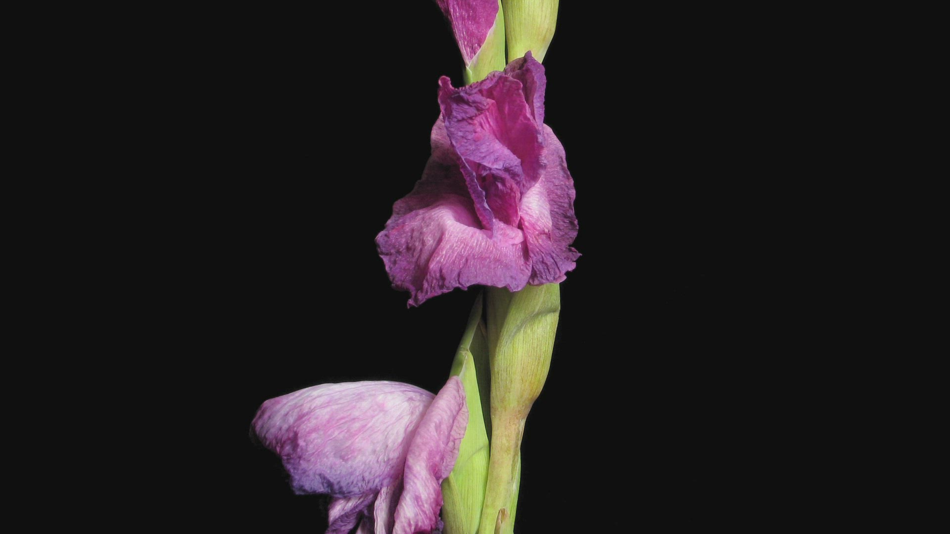 Timelapse of a pink gladiolus flower blooming on black background, whole stem and close up view.