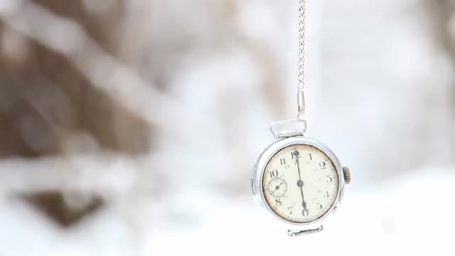Winter time idea. Pocket watch and falling snow in a winter park