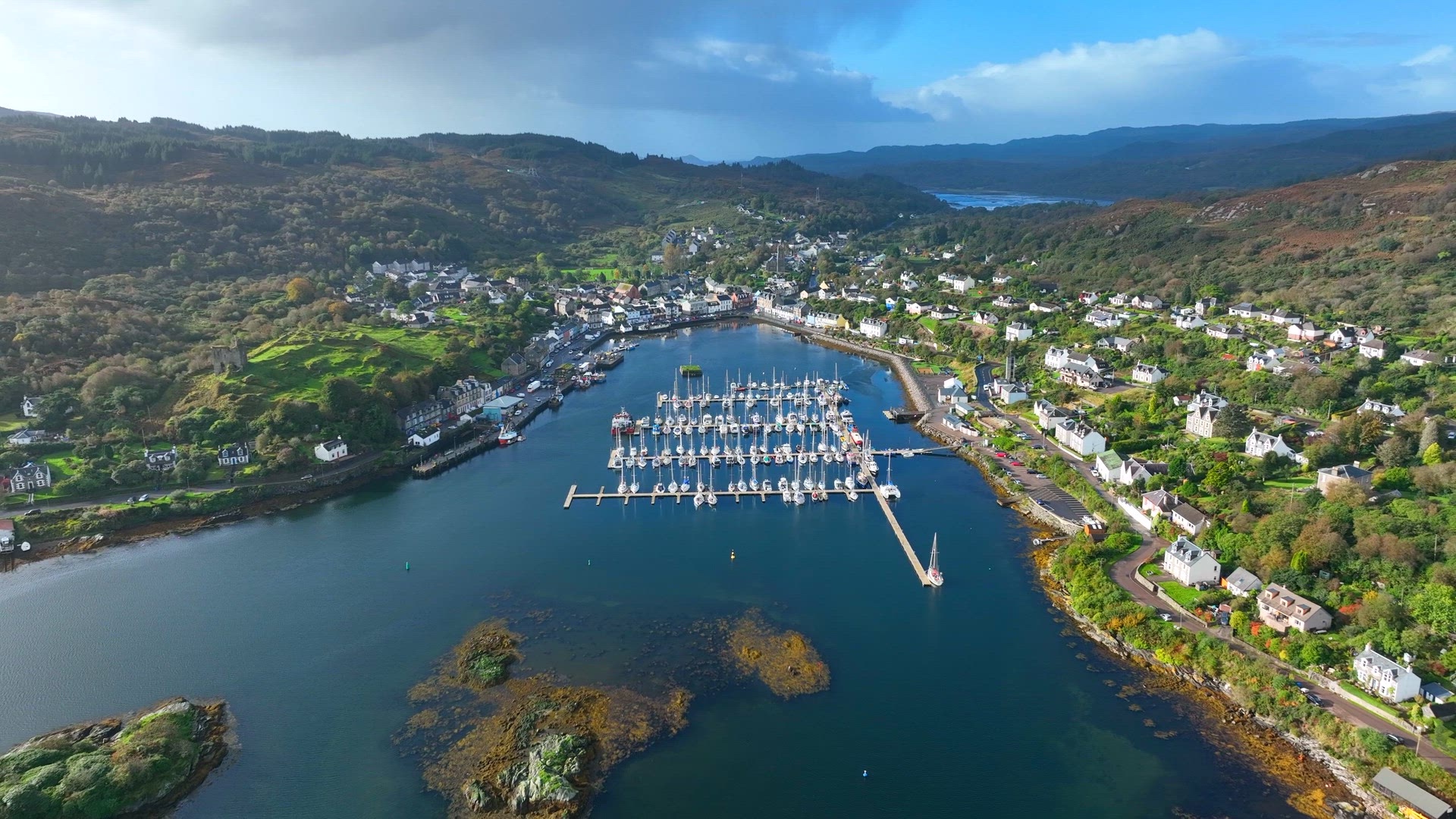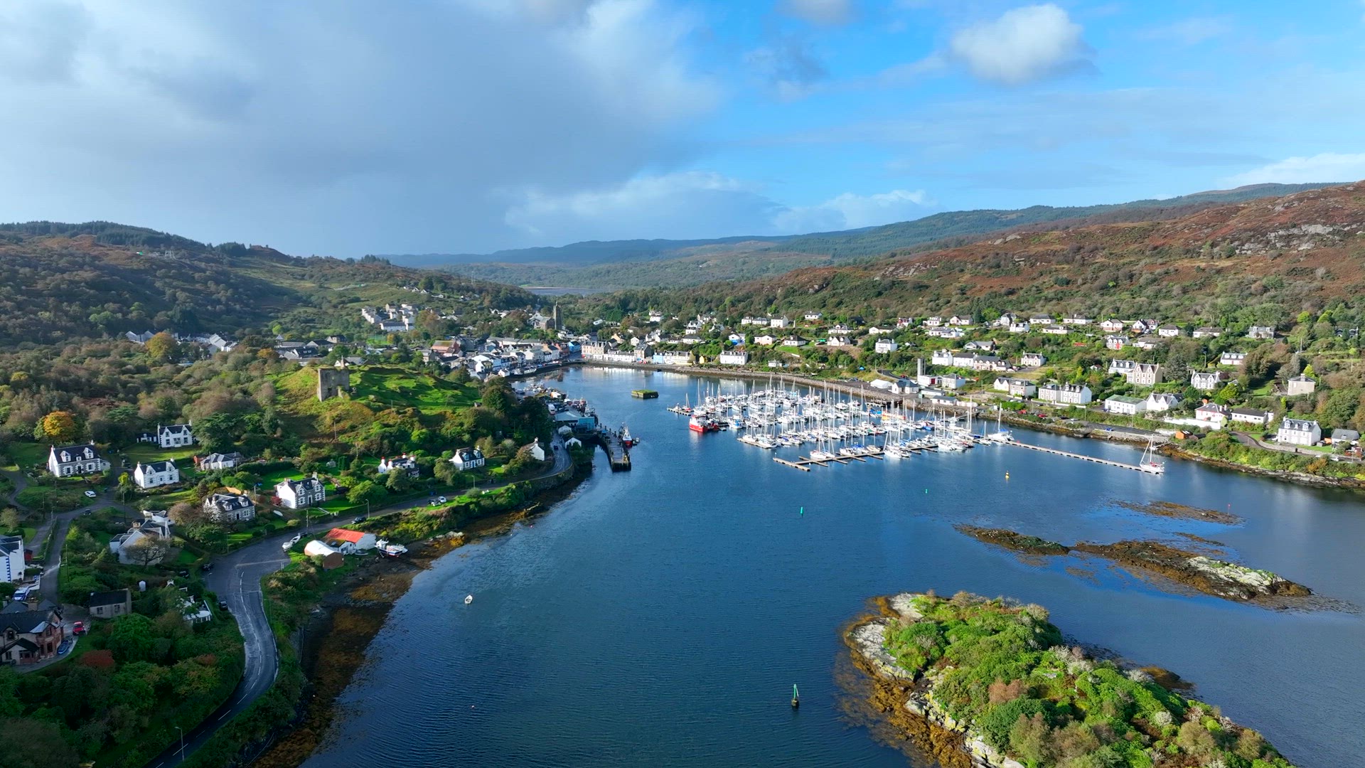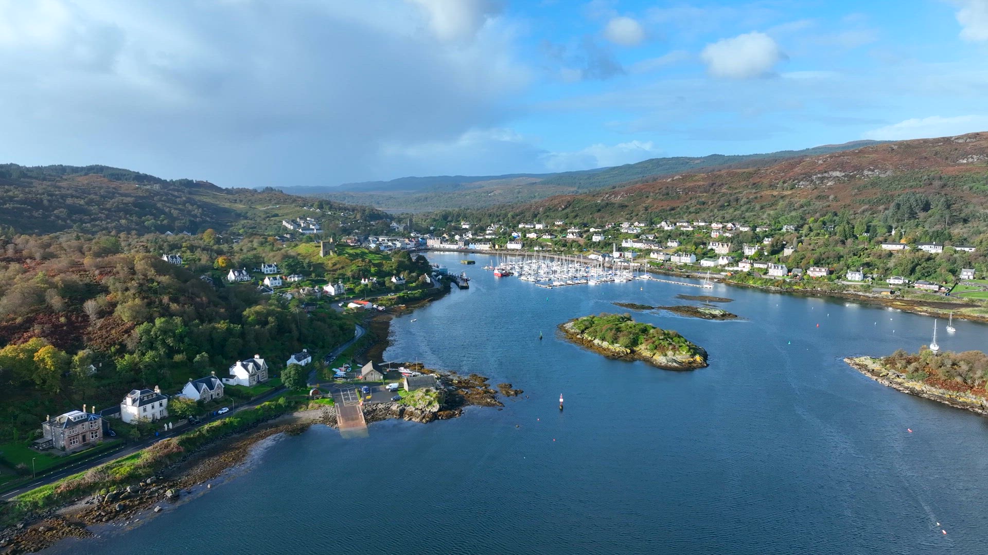 476087 - Aerial shot of sailboat and small marina town