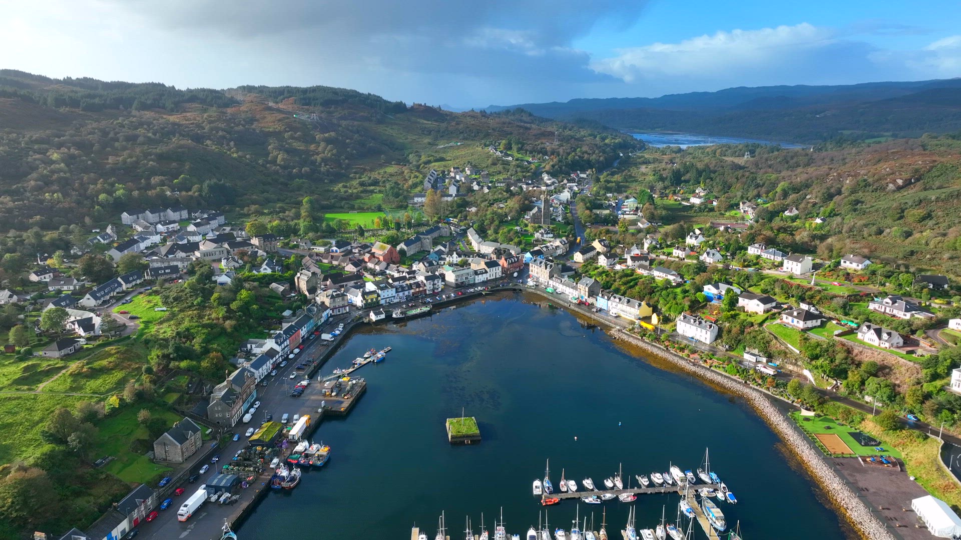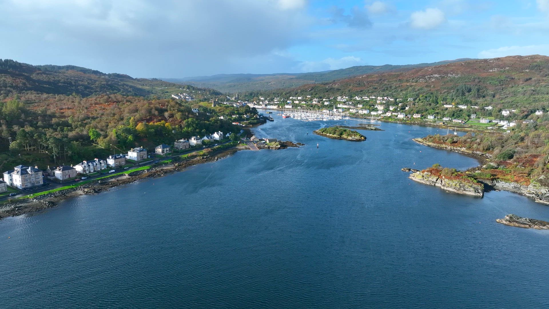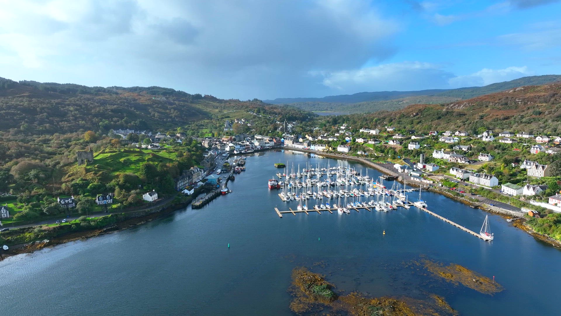 476087 - Aerial shot of sailboat and small marina town