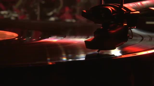Record player. Vinyl on turntable. Red light. Retro version. Extreme closeup.
