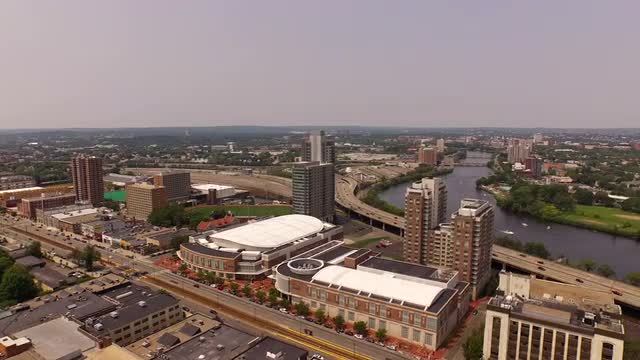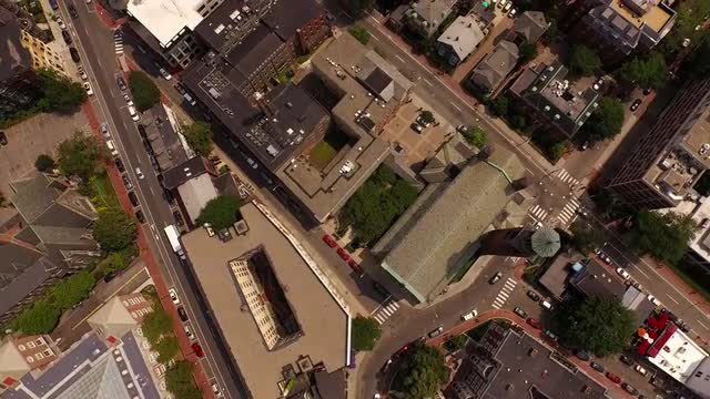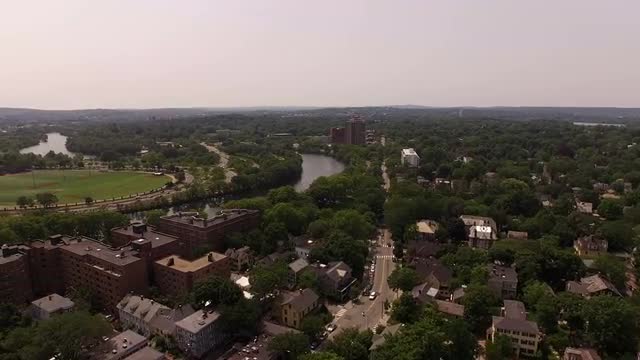 v107 Flying low backwards over Harvard campus with cityscape views panning down.
