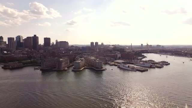 v36 Flying low over inner Boston Harbor panning right with cityscape views.