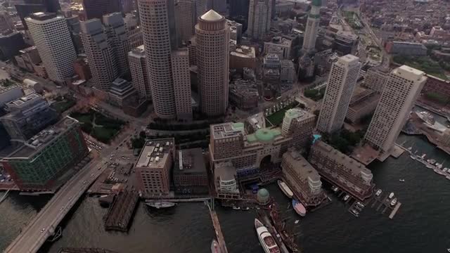 v27 Flying low over Charles River panning right with MIT campus and cityscape views.