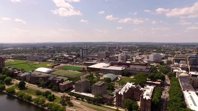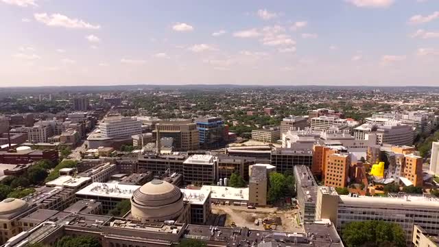v17 Flying low over MIT campus with side view.