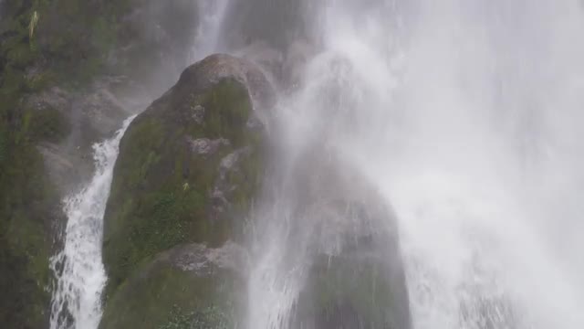 > Close shot of waterfall crashing down on rocks