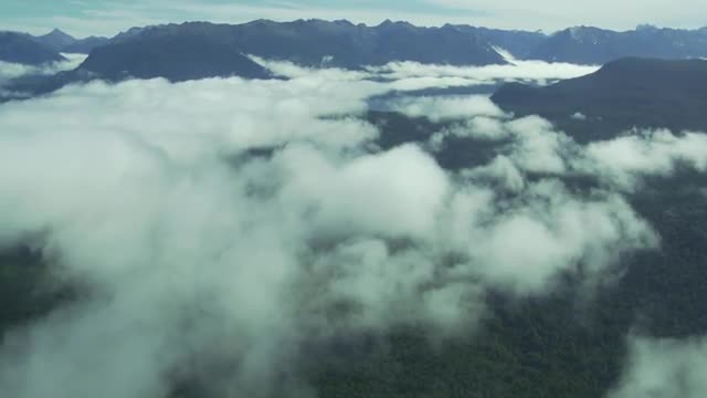 > Wide shot of mountain in distance with ocean in foreground