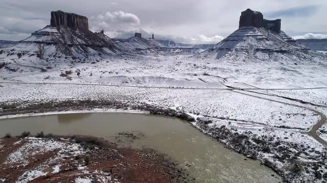 1092067 - Flying over the Colorado River through winter landscape in Castle Valley