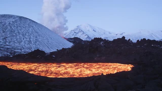 River of lava with erupting volcano in background