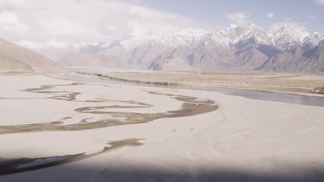 476194 - Aerial shot of dirt road along river valley in Pakistan