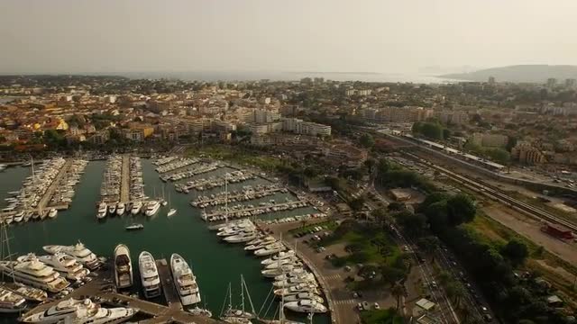 v33 Flying low over Antibes Harbor panning left with full city views.