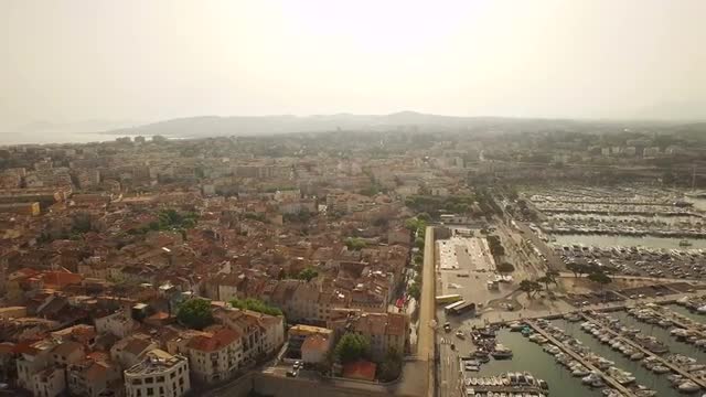 v31 Flying low over beach and waterfront panning right with full city view.