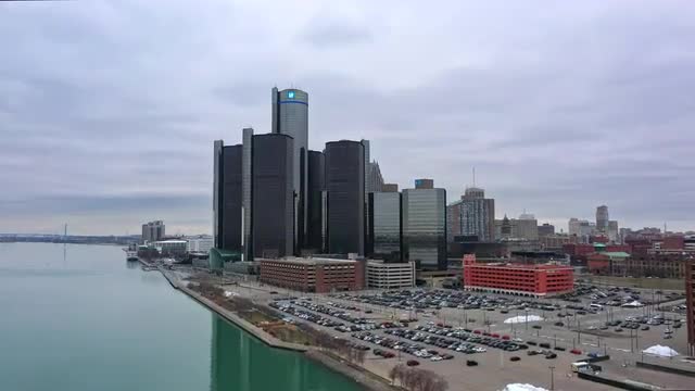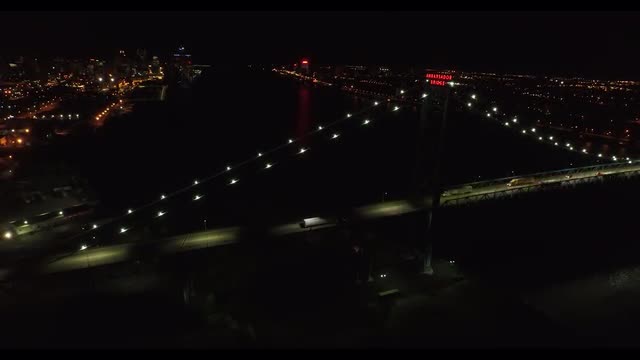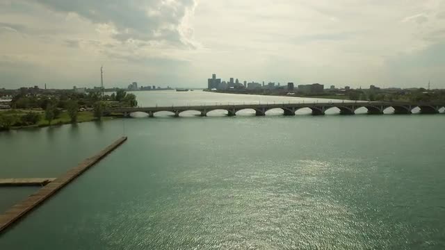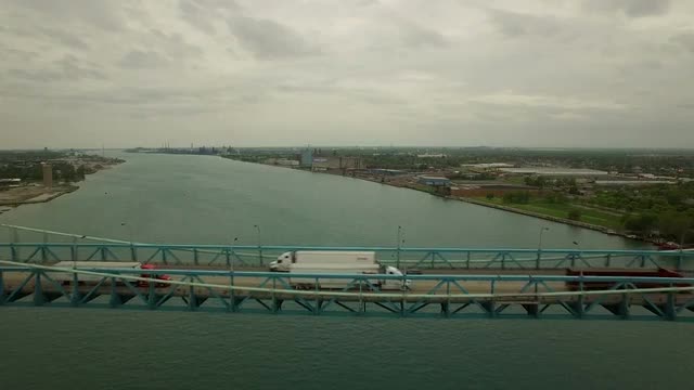 v89 Flying low over Ambassador Bridge panning right with cityscape views.