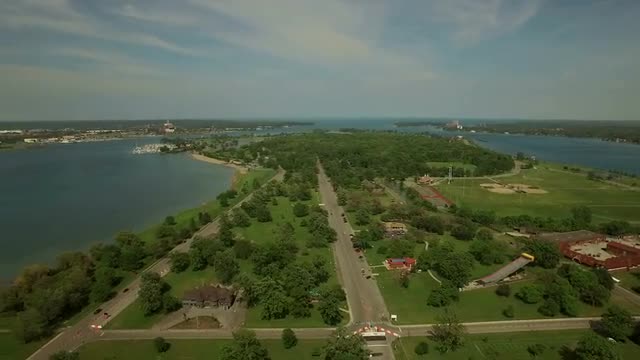 v73 Flying low over Belle Isle panning left with multiple views.