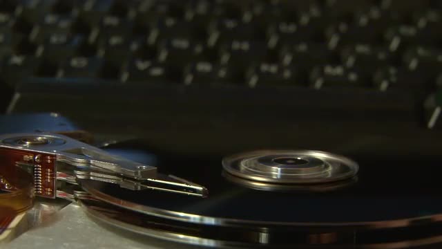 Hard Disk Drive, computer data storage, keyboard in background.