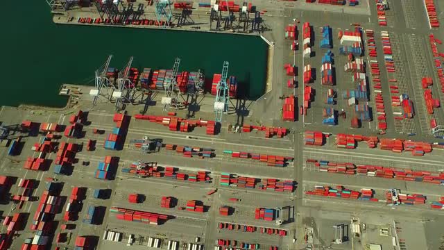 v11 Flying vertical shot looking down over large commercial shipyard and ships.