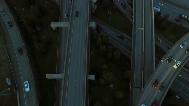 v71 Flying low vertical shot looking down over freeway and interchanges.