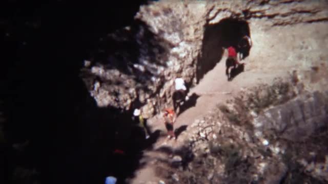 1972: Horse riding group going into rocky dry dark unknown tunnel.