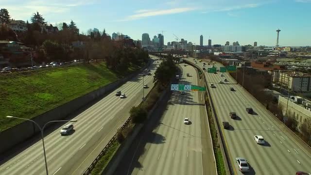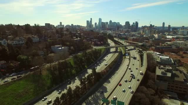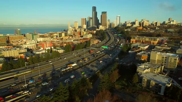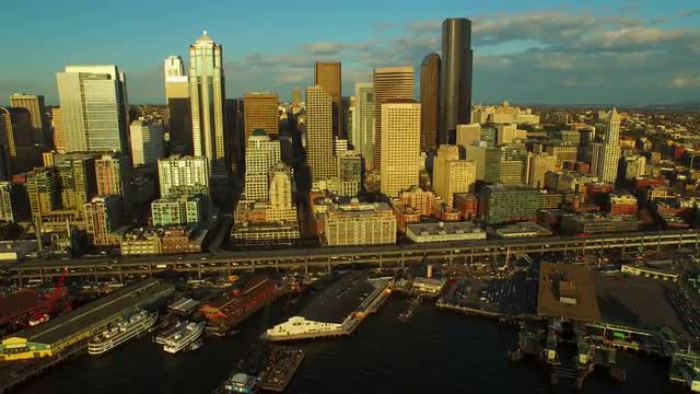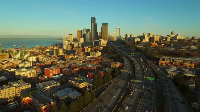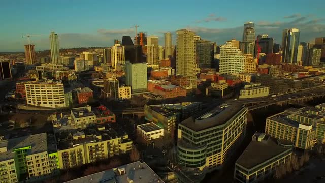 v45 Flying low over waterfront area with cityscape views at sunrise.