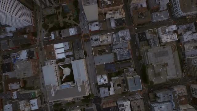 v71 Low flying vertical shot looking down over Nob Hill and downtown at sunrise.