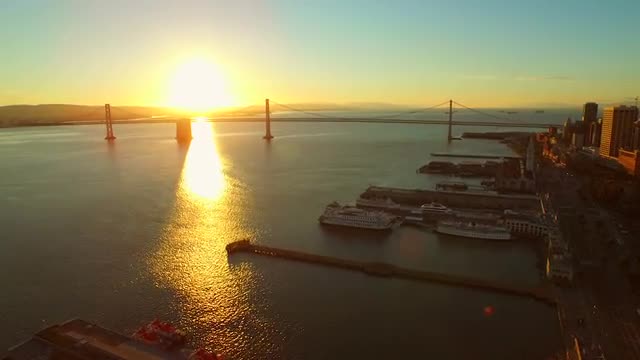 976426 - Aerial view of San Francisco city skyline and Bay Bridge at sunrise
